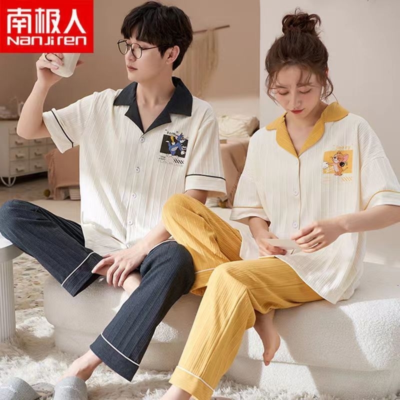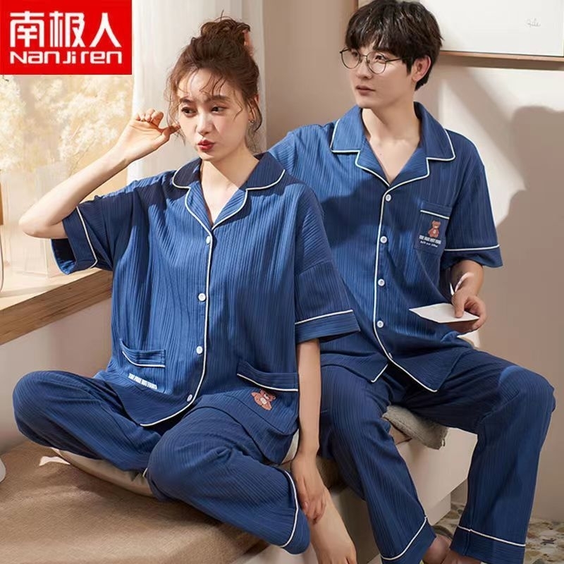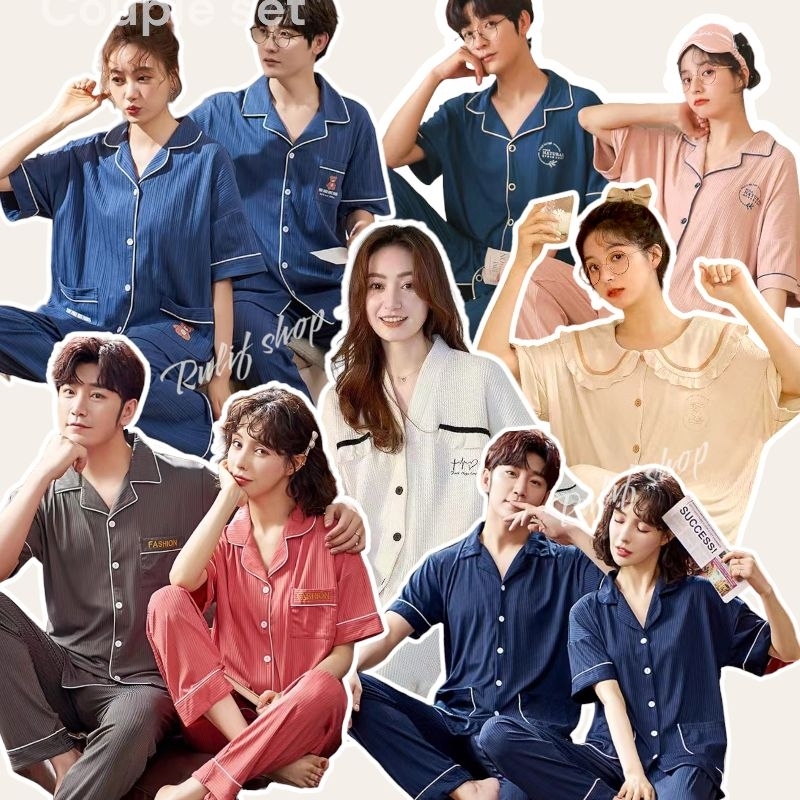 Rulif Piyama Baju Tidur Wanita Pria Couple Dewasa Bahan Katun Halus Lengan Pendek Celana Panjang Krah vneck Naturall
