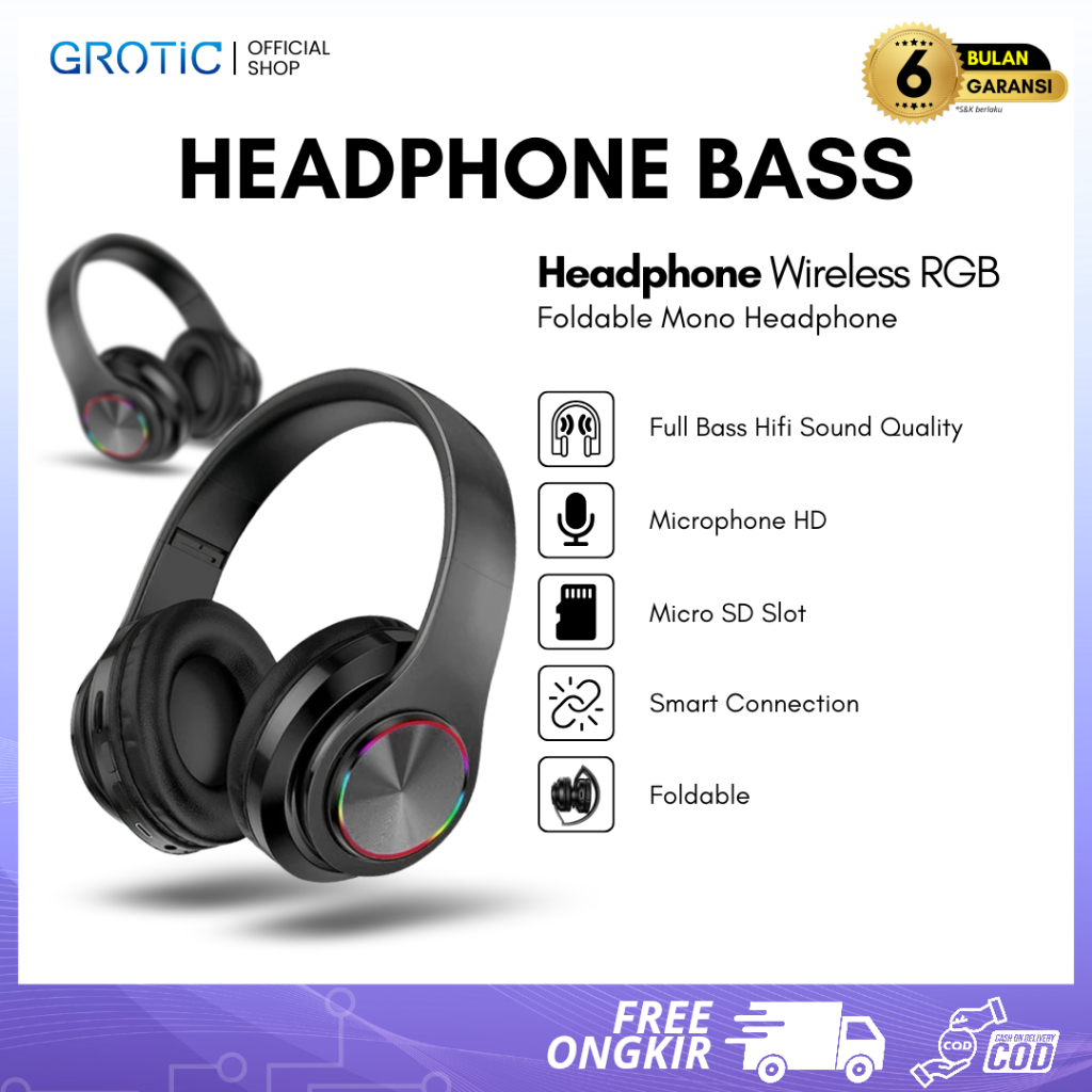 GROTIC Headphone Bluetooth Bass Mono RGB Foldable B39
