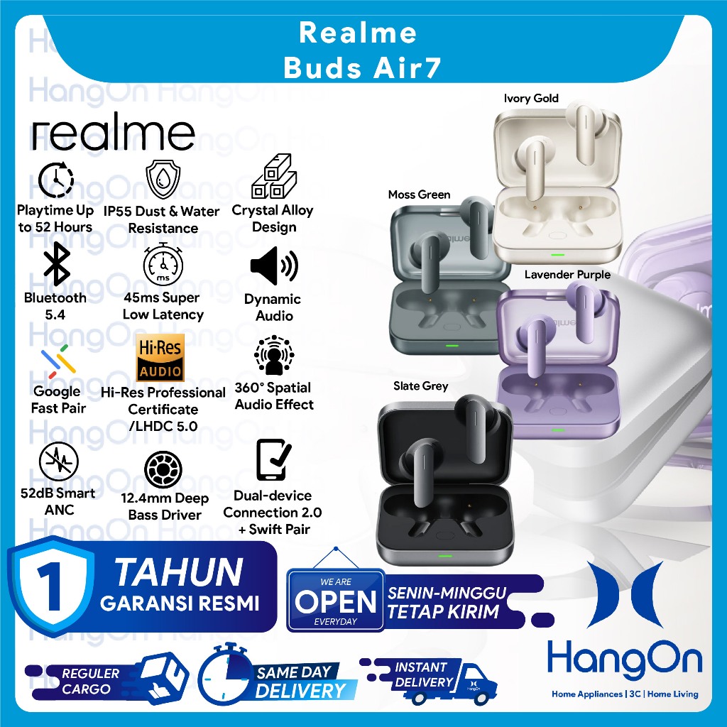 Realme Buds Air7 Hi-Res LHDC 5.0 Wireless Earbuds 45ms Low Latency 52dB Smart Active Noice Cancellation 12.4mm Deep Bass TWS Earbud Waterproof