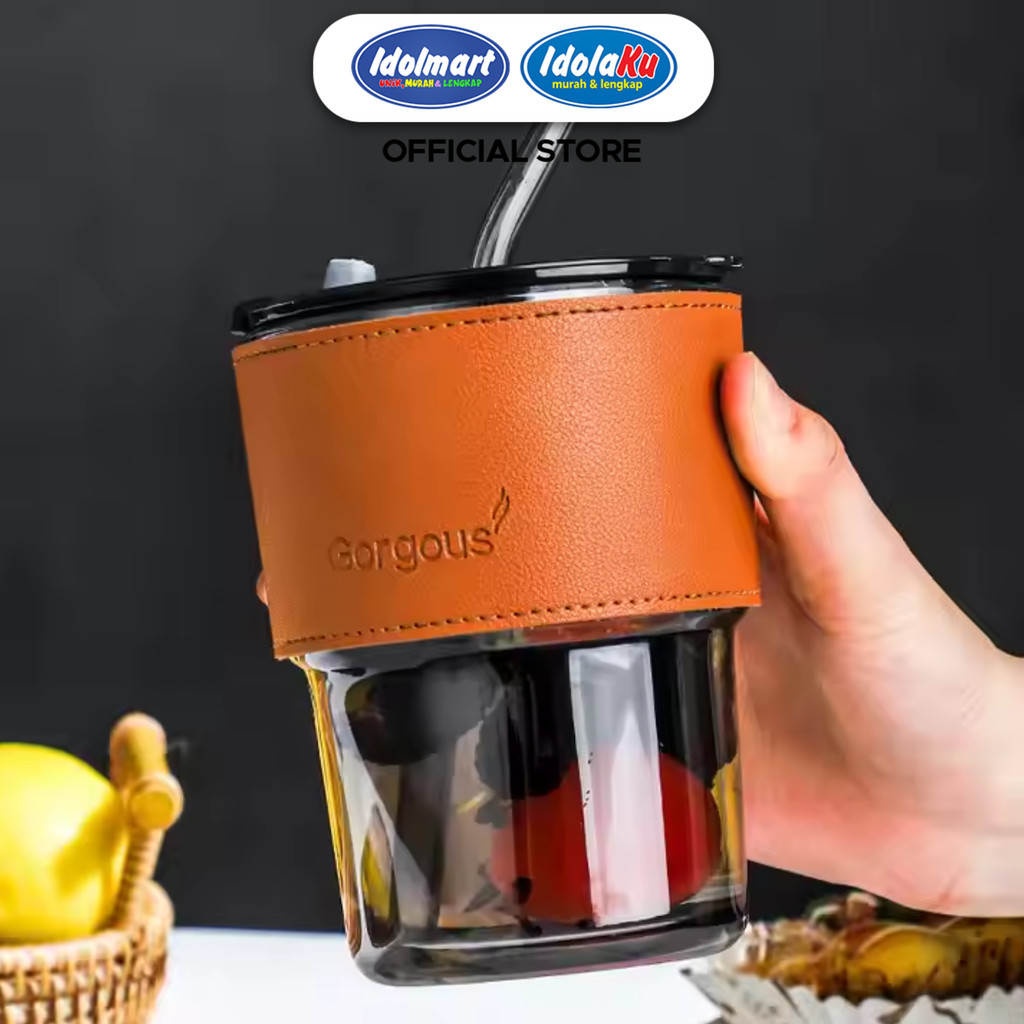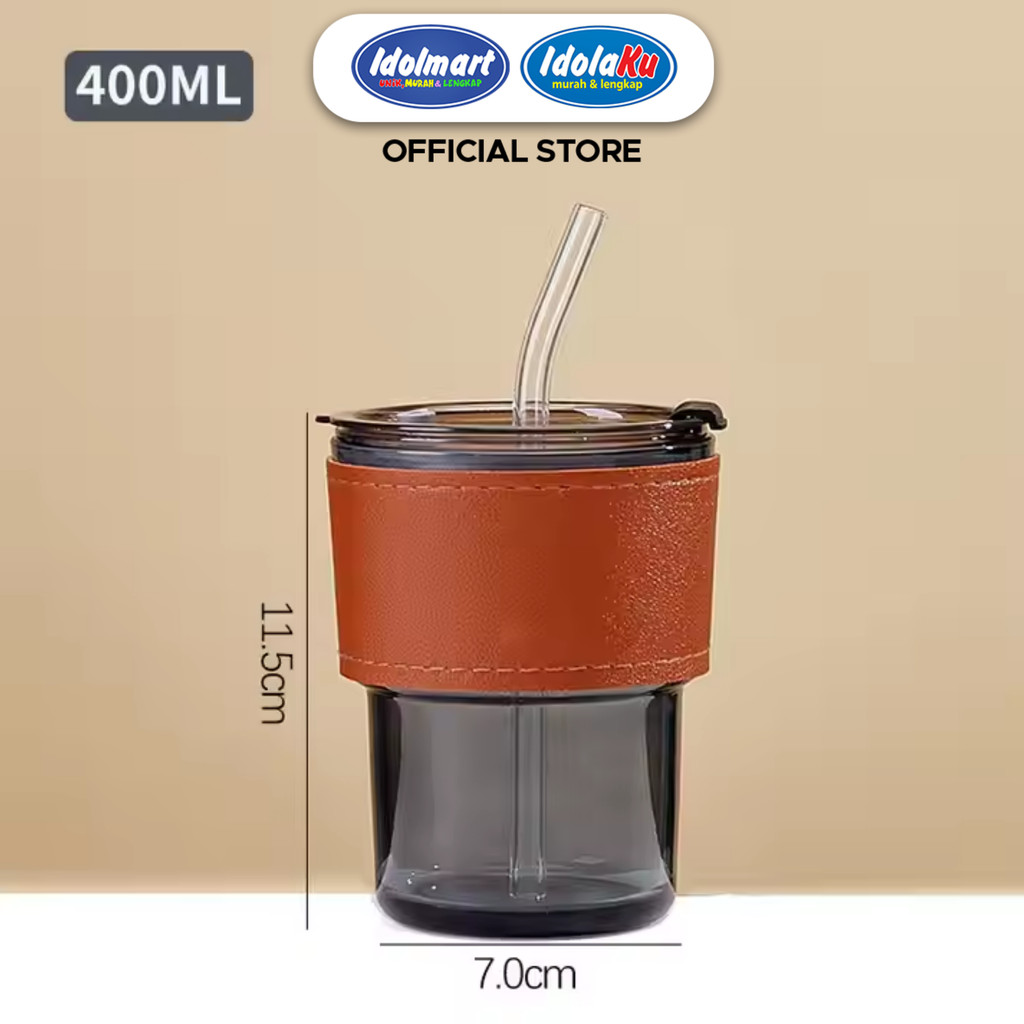 IDOLMART Mug Kaca Lapis Kulit 400 ML Gelas Kaca Anti Tumpah Tumbler Minum Sedotan Murah Gratis Ongkir Garansi Pengiriman