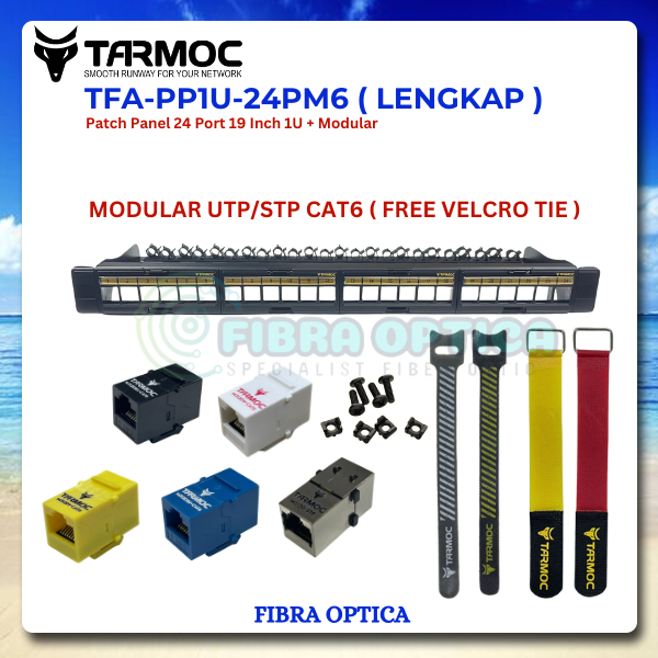 Tarmoc TFA-PP1U-24PM6 | Patch Panel 24 Port RJ45 UTP Cat5 Cat6 LENGKAP Free 8 pcs Velcro tie