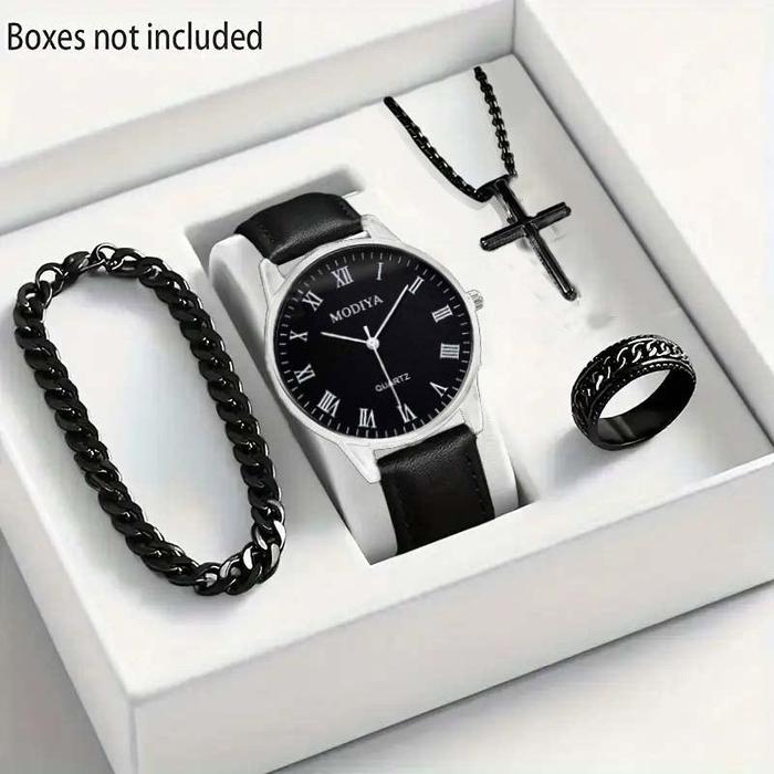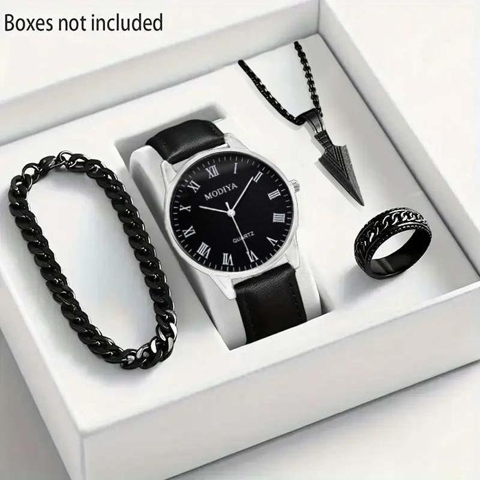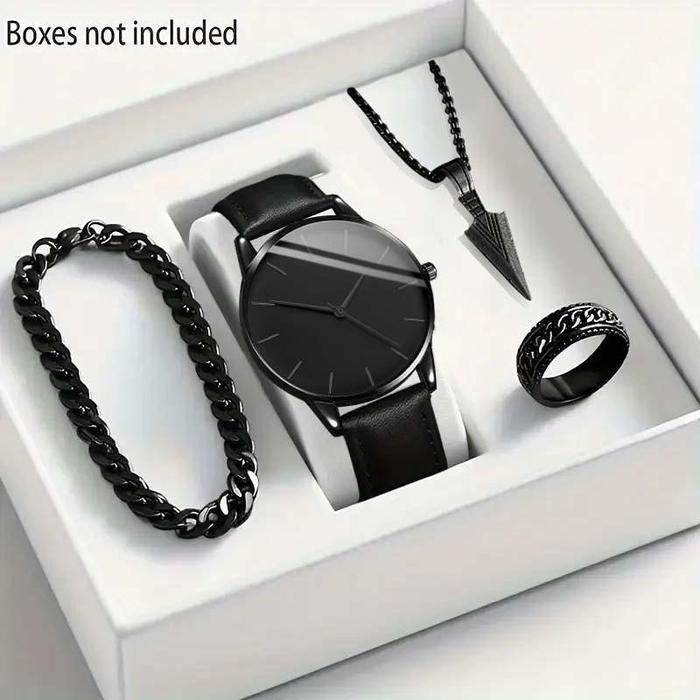 Jam Tangan Pria Quartz Dengan Jarum Jam Dial Dan Tali Kulit - Set Perhiasan Mode(Tanpa Kotak) - Black(Only watch)
