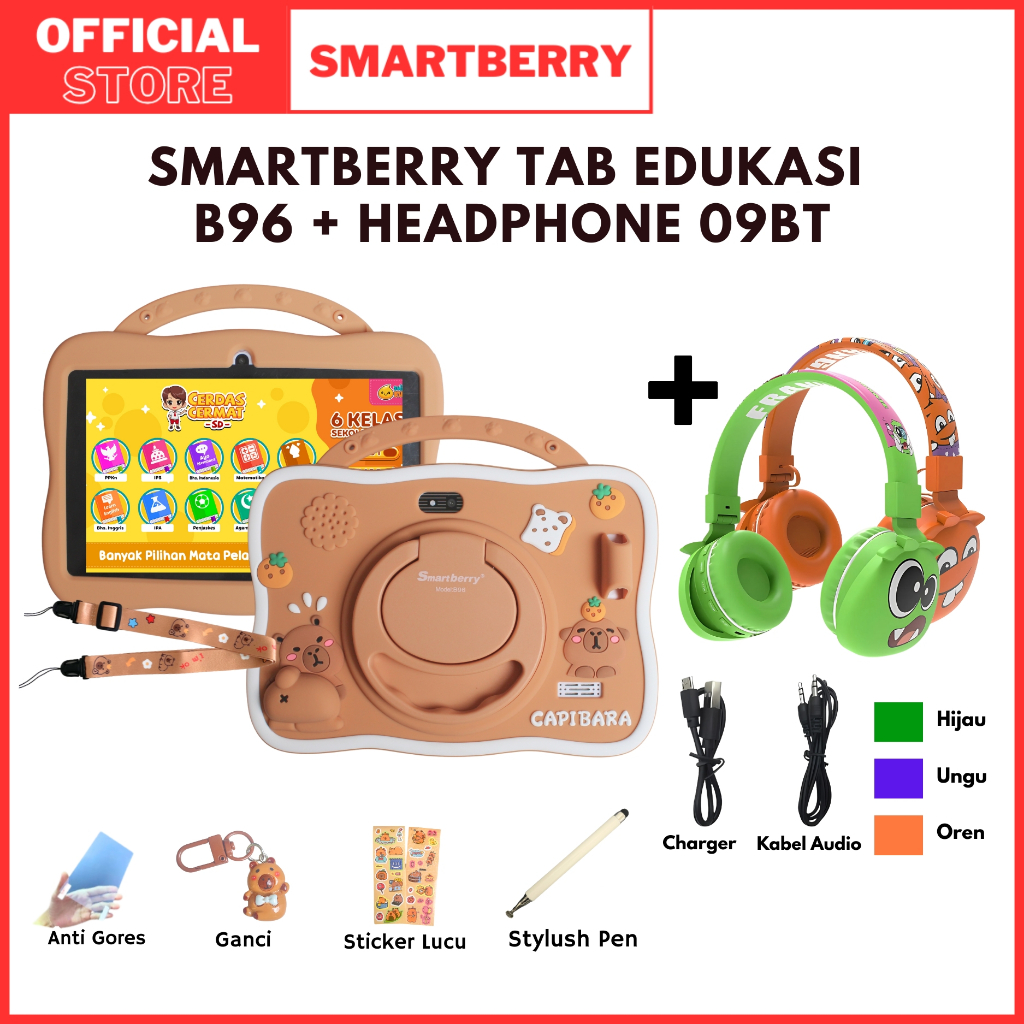 SMARTBERRY KIDS STUDY TAB B96 + Headphone 09BT 4/128GB Bluetooth WIFI Aksesoris Belajar Anak karakter lucu hadiah