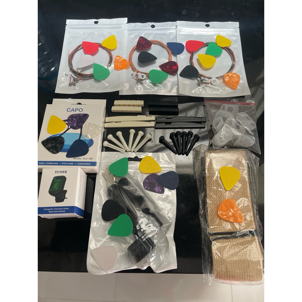 1 Set Bundle Aksesoris Gitar Lengkap – Capo, Tuner, Strap, Pick, Senar, dan Lainnya