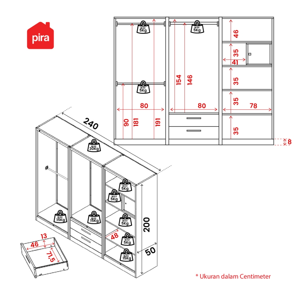 PIRA - ASHTON 6P FGD MWD Lemari Pakaian Besi 6 Pintu dengan Laci dan LED