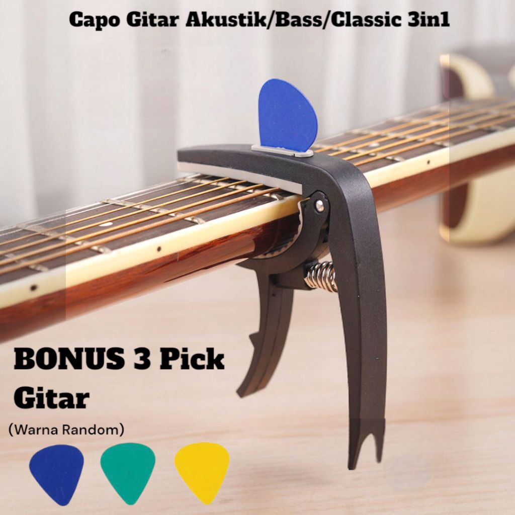 Capo Gitar Akustik 3in1 Multifungsi dengan Penarik Pin Bonus 3 Pick Gitar