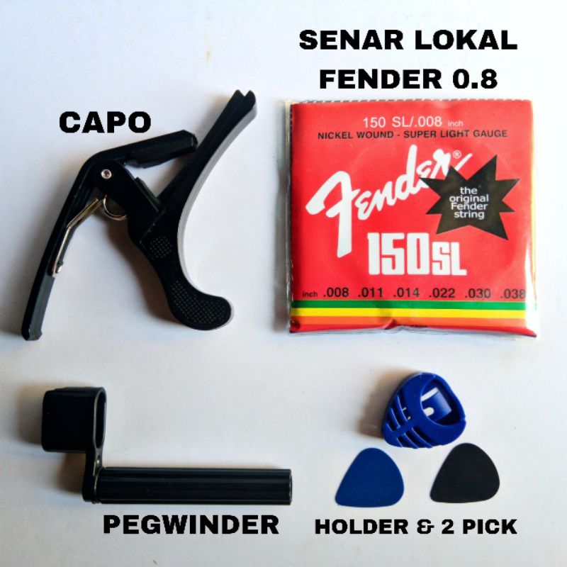Paket Capo + Senar Lokal Fender 0.8 + Pegwinder + Holder Pick Gitar