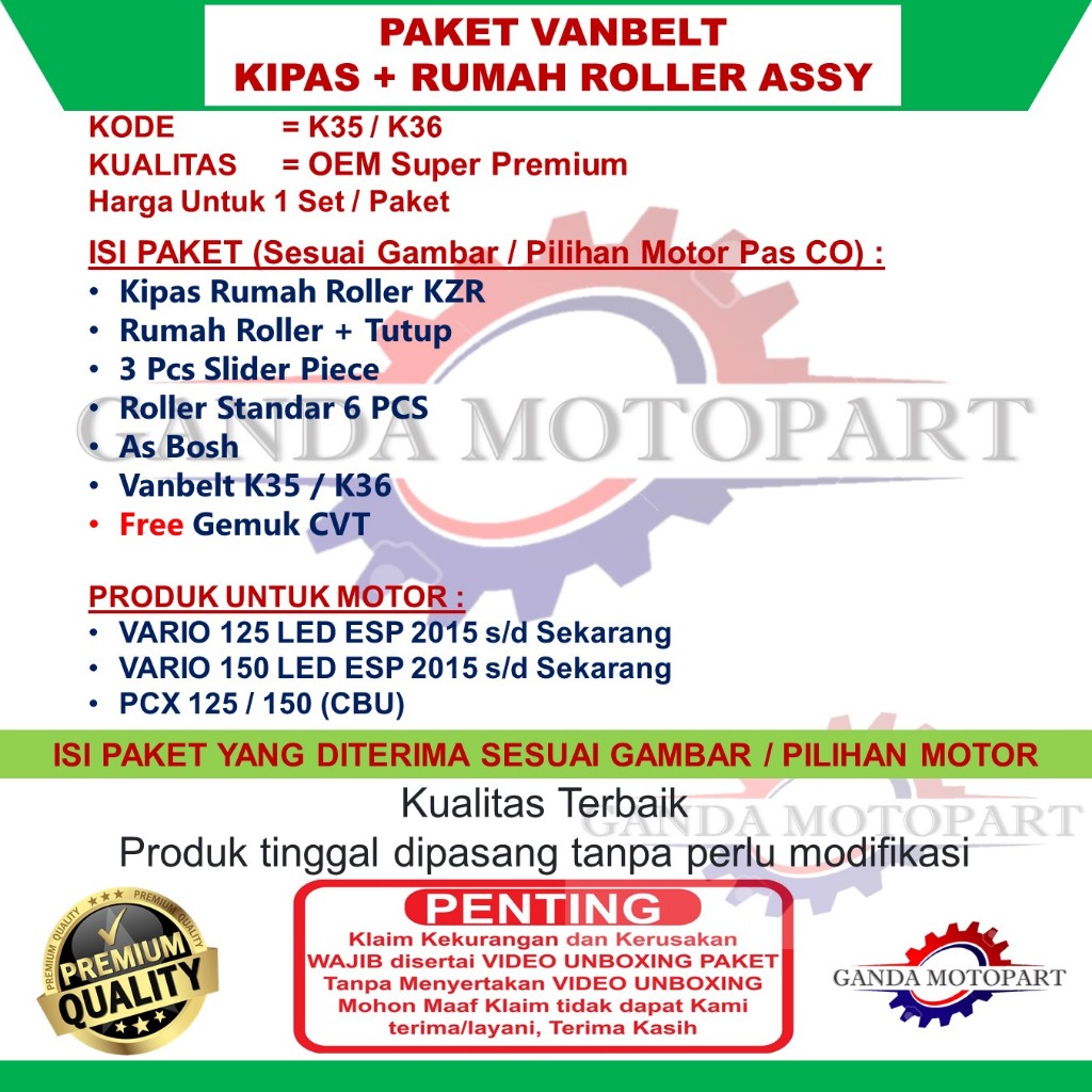 Paket Vanbelt Kipas Rumah Roller Set Vario 125 fi Tekno KZR Vario 125 150 Led Esp K35 K36