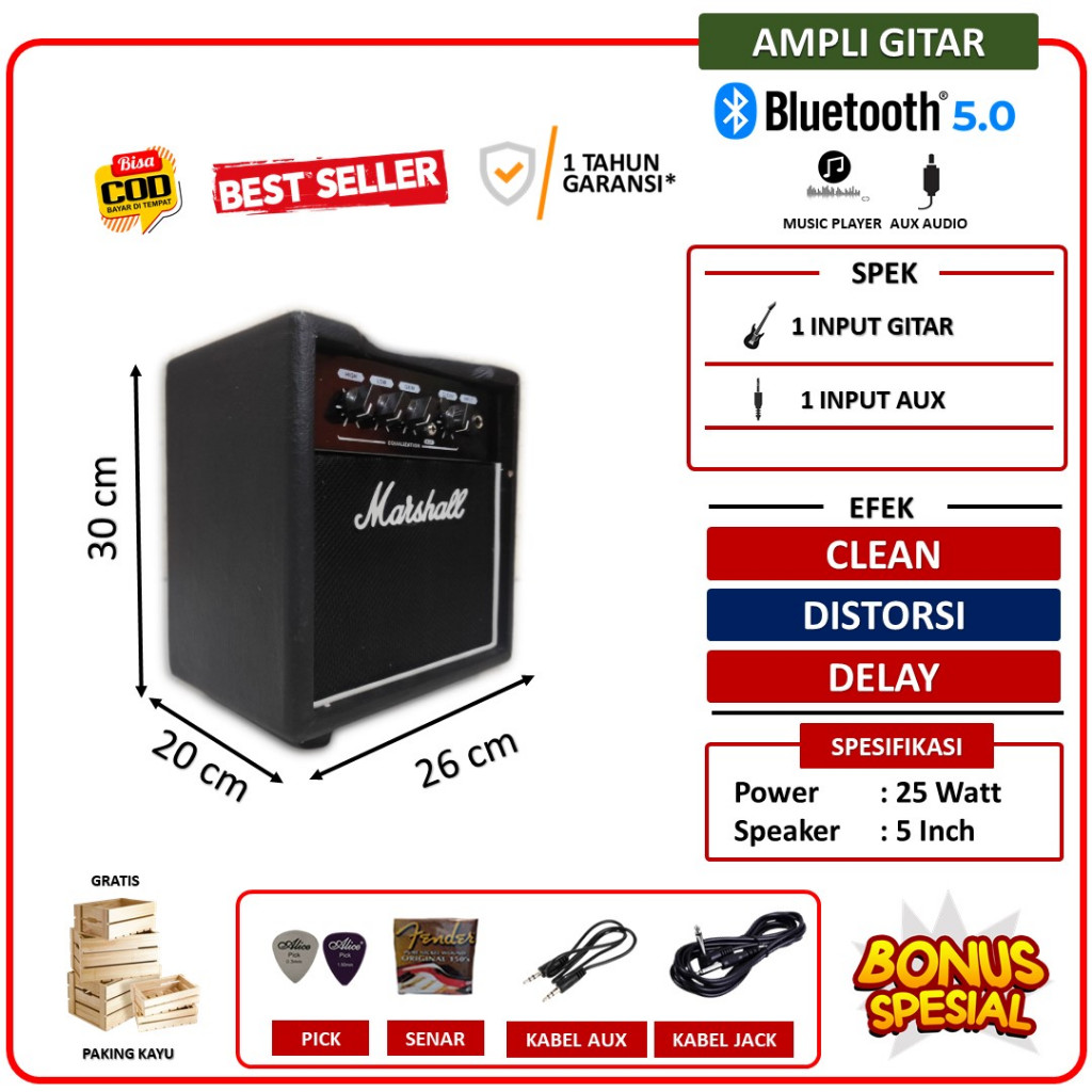 ampli gitar & bass 5 inch 2 Input plus efek distorsi & aux termurah banyak bonus