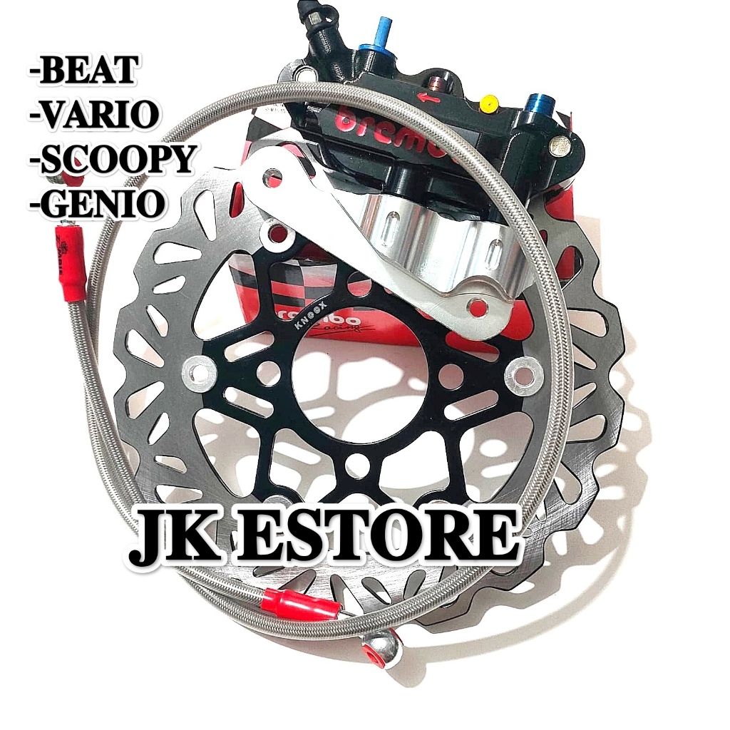 Paket Kaliper Kiri 4 Piston + Breket Kiri Beat, Vario, Scoopy, Genio + Selang Rem 95CM + Piringan Gerigi 220MM + Baut Ke