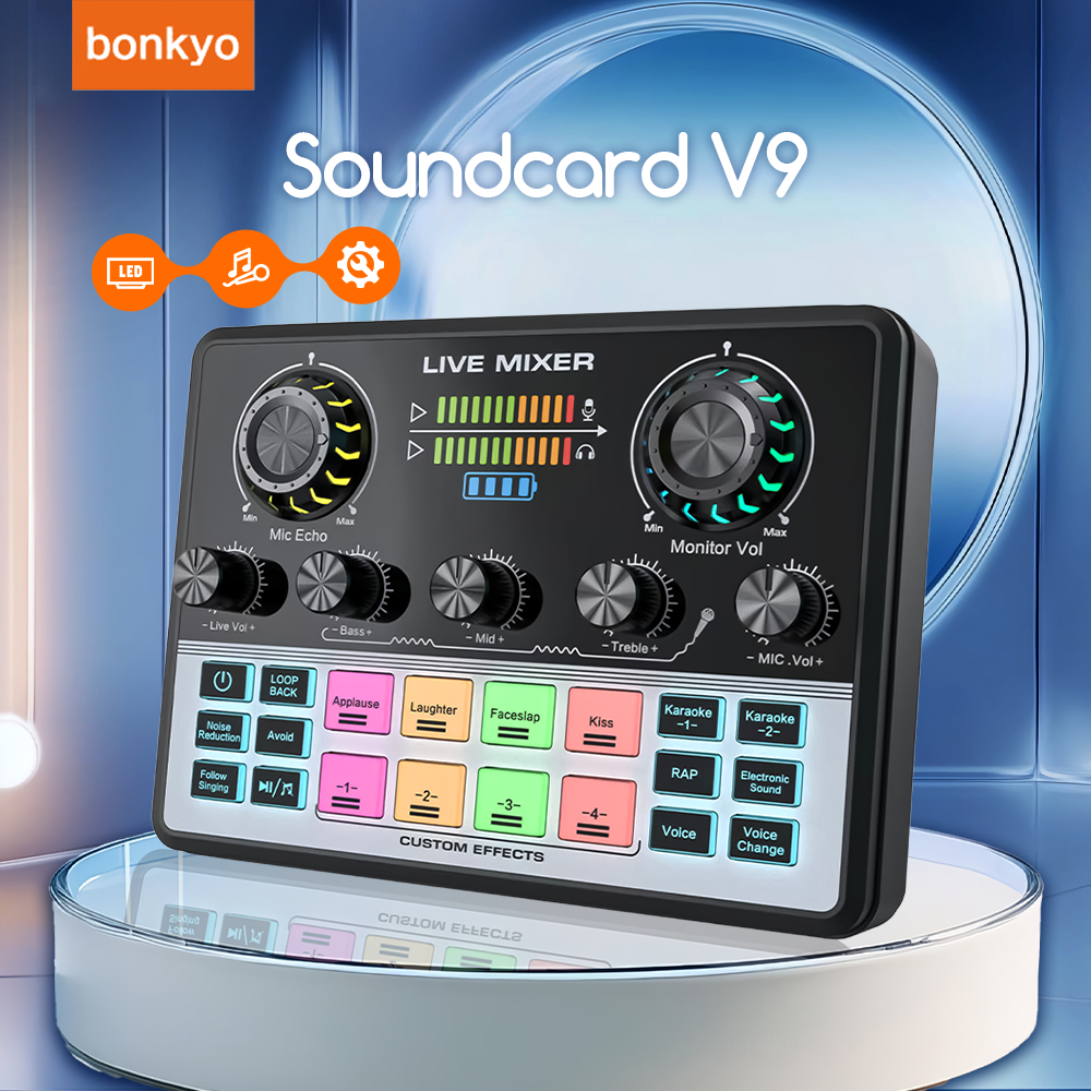 Bonkyo V9 Soundcard Mixer Multi Fungsi – Alat Live Streaming/Nyanyi dengan Pengurangan Kebisingan & Ganti Suara