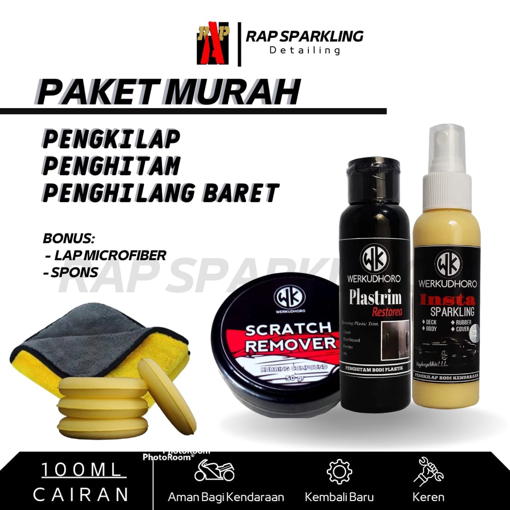 Paket PEMBERSIH Kendaraan / Pengkilap Body kendaraan 100ml / Penghilang Baret Lecet Gores WK / Penghitam Body Motor / lap kuning