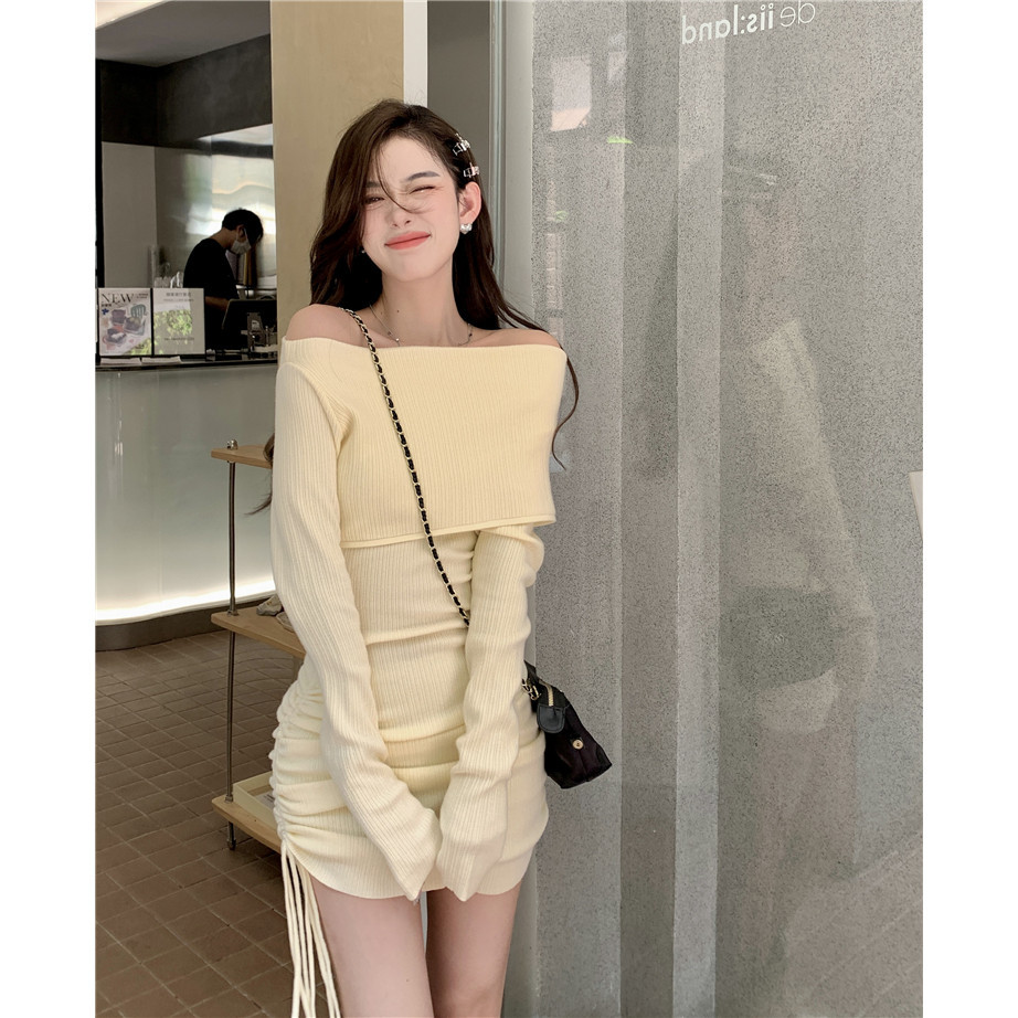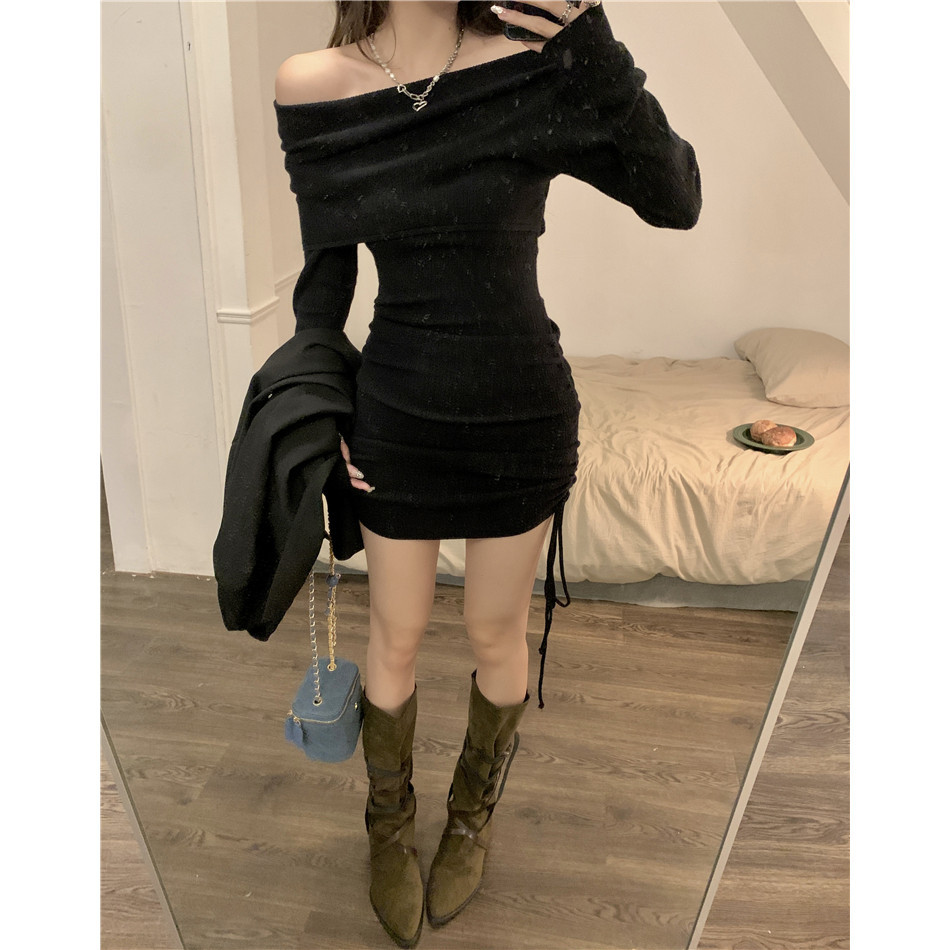 66TT Dress Darling HHWG206 Gaun Rajutan Seksi Dengan Pinggang, Gaya Nafsu Murni, Rok Pendek Satu Bahu, Lengan Panjang, M