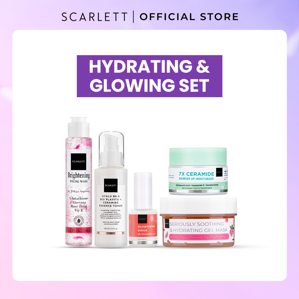 Scarlett Whitening 5pcs ( acne set, hydrating & glowing set, brightening set, anti aging set, skin barrier set, exfoliate set ) Mencerahkan Melembabkan