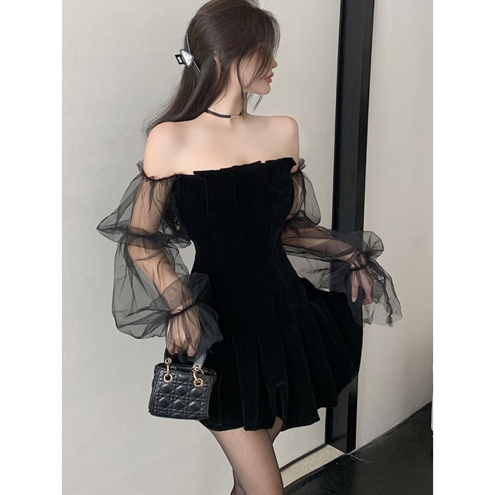 EMITA BLOOM Black Mini dress hitam lengan panjang Korean Style black dress halloween party dress kondangan wedding baju