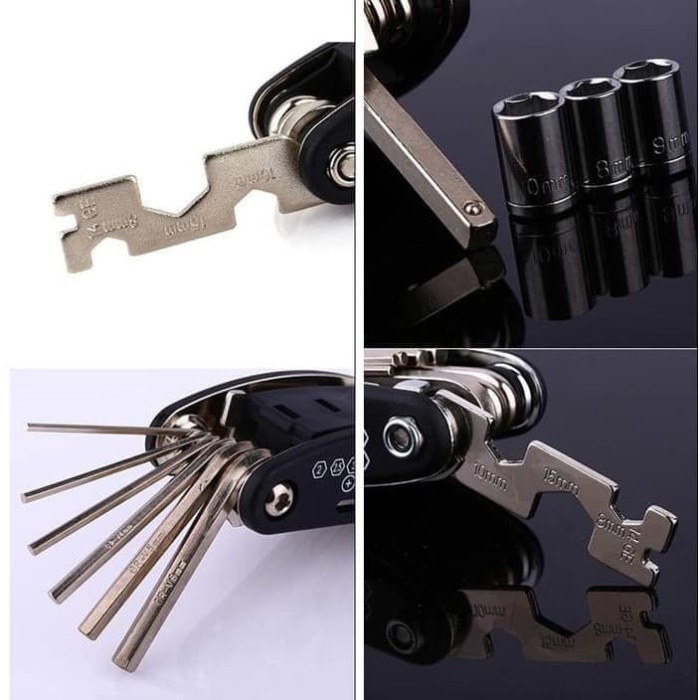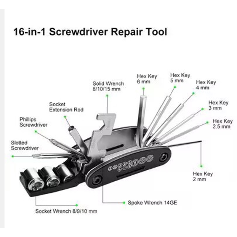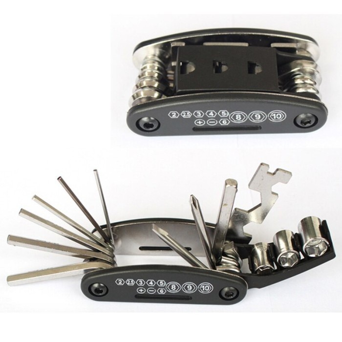 Set Alat Multifungsi 16 dalam 1 untuk Sepeda: Kunci Shock Lipat, Kunci Sepeda, dan Kunci Obeng 16 in 1