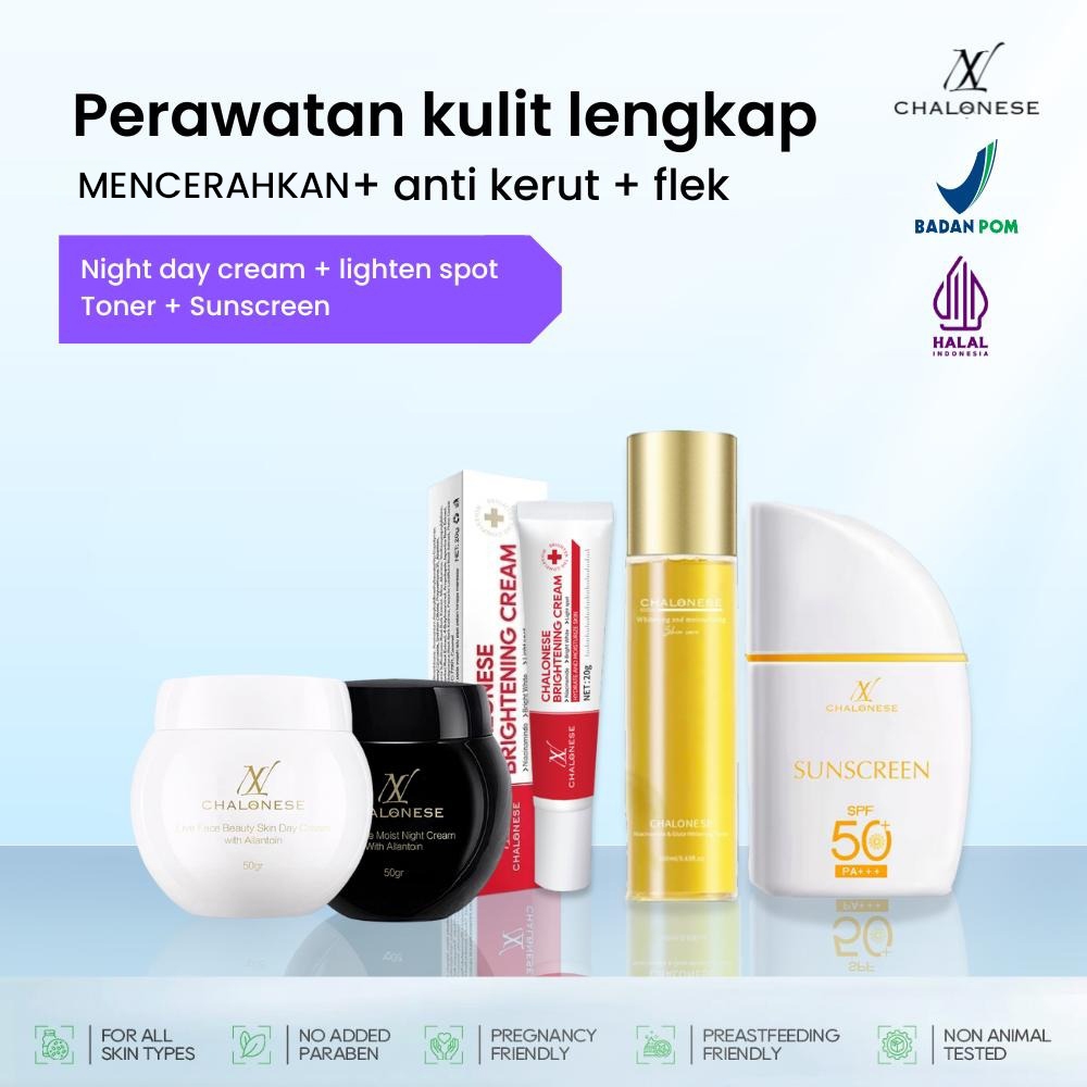 [CHALONESE] PAKET FLAWLESS SKIN SET 5IN1 (1SET MOIS+1PC WHITENING+1PC TONER+1PC SUNSCREEN) Mampu Mengatasi Flex Hitam di Kulit Wajah dan Membuat Wajah Lebih Cerah