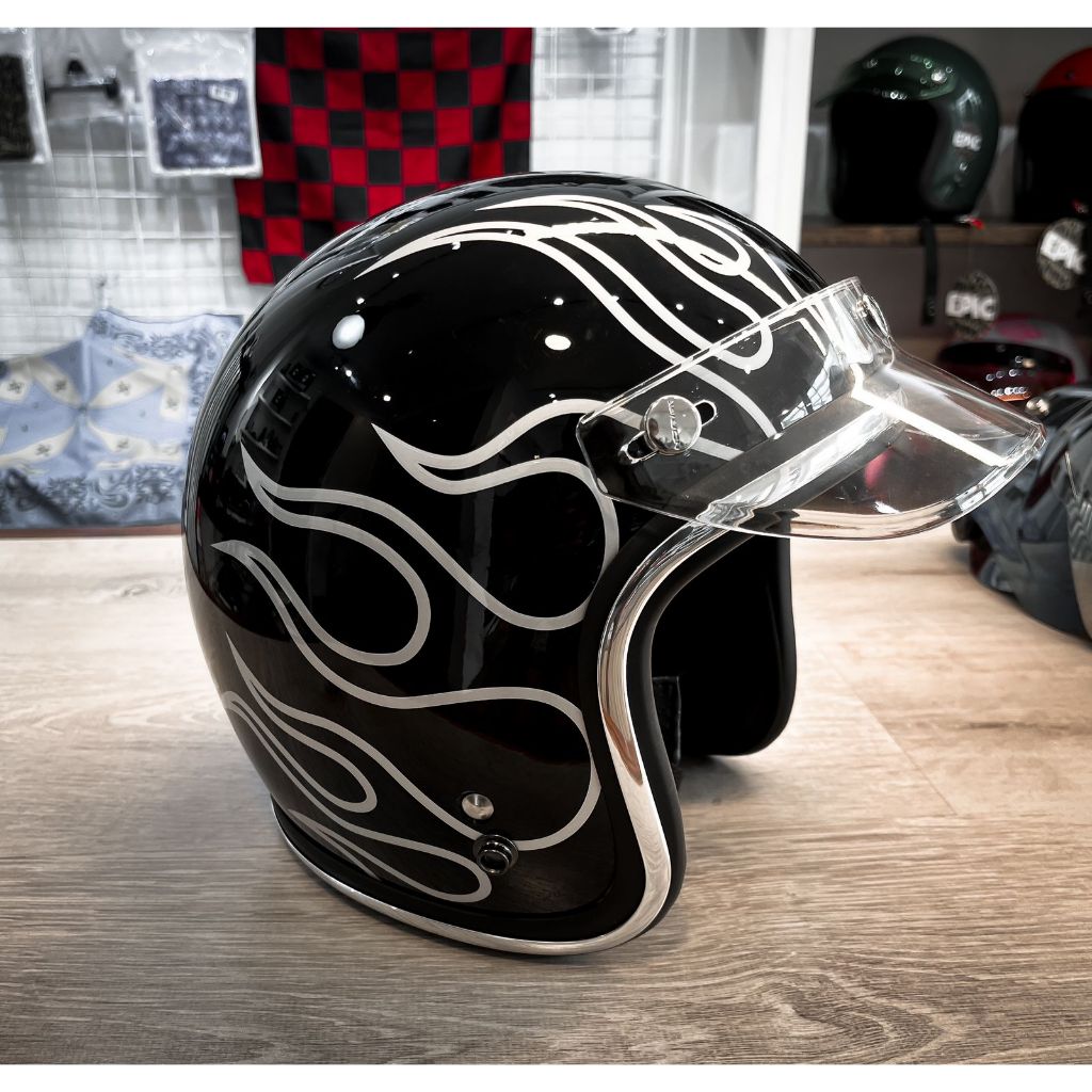 π§ππ₯π π¨π₯ππβ Epic Veil Slim Head EV-500 Open Face Black Flame Pattern List Silver Helm Half Face SNI