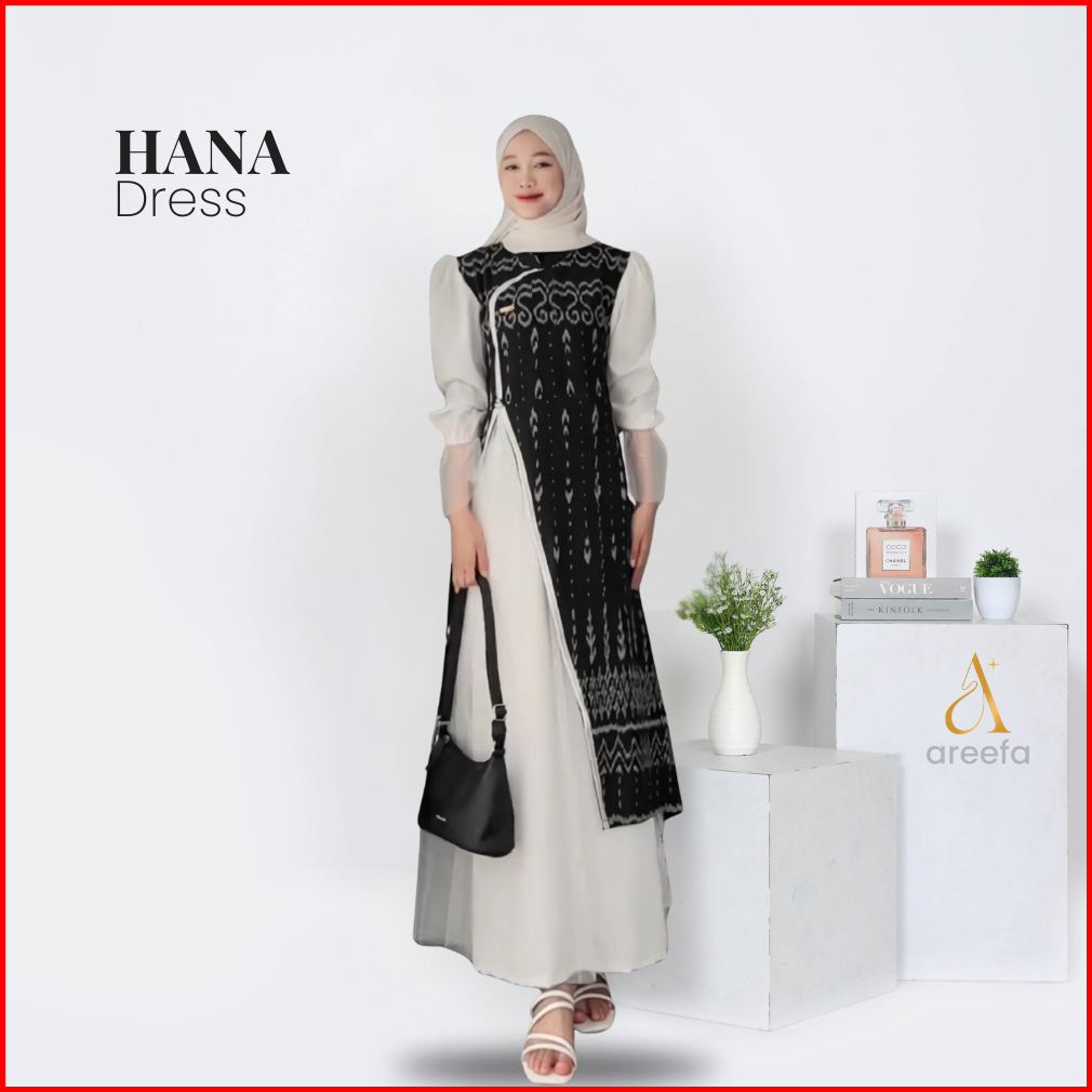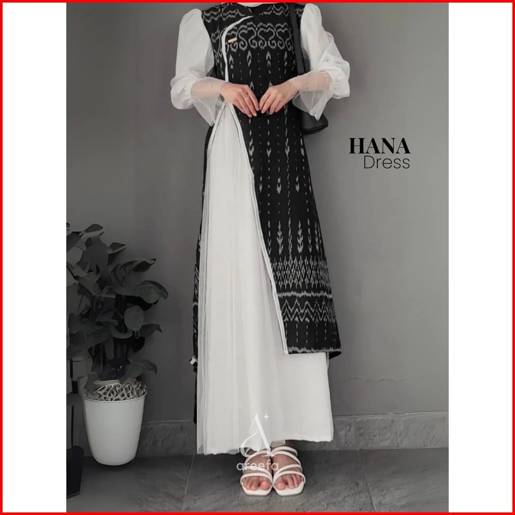 Areefa - Hana Dress Gamis Tenun Etnik Kombinasi Katun Tile Premium Wanita Remaja Kondangan Hitam