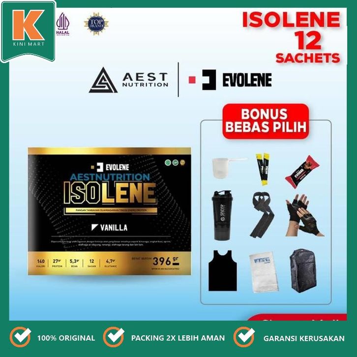 Evolene Isolene Whey Protein Isolate Kemasan Box isi 12 Sachet/KINI MART/CEMILAN/GROSIR/MURAH/SNACK/HAMPERS