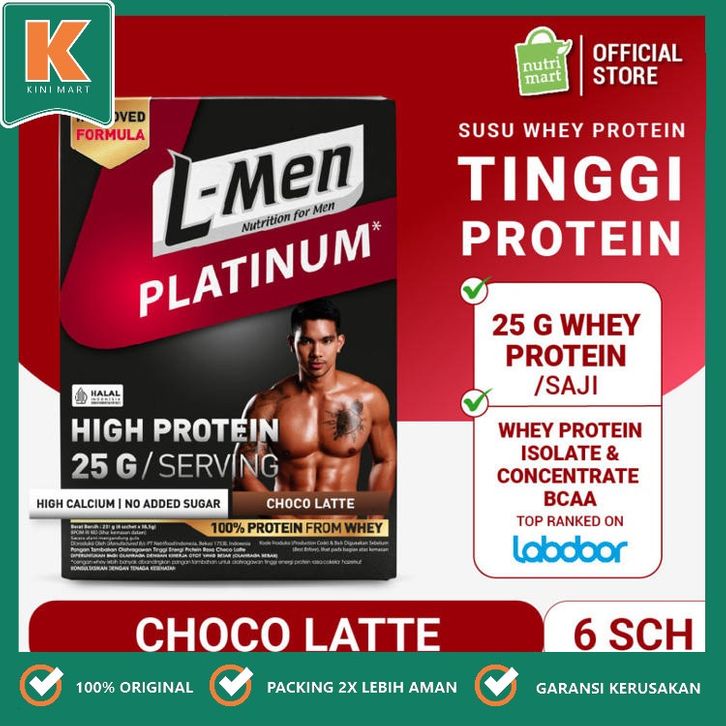 L-Men Platinum Choco Latte Box isi 6 Sch (25g protein/serving) - Suplemen Tinggi Whey Protein Rendah Lemak/KINI MART/CEM