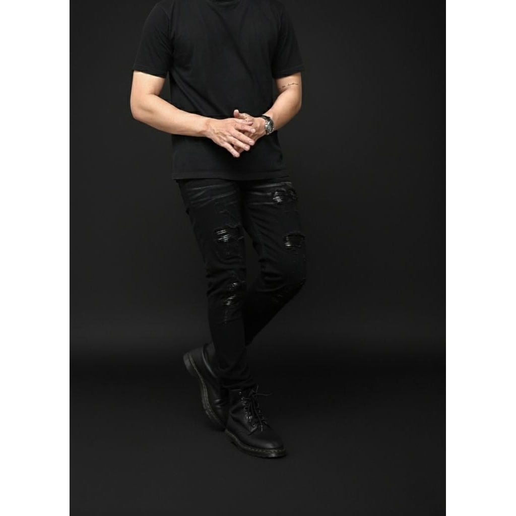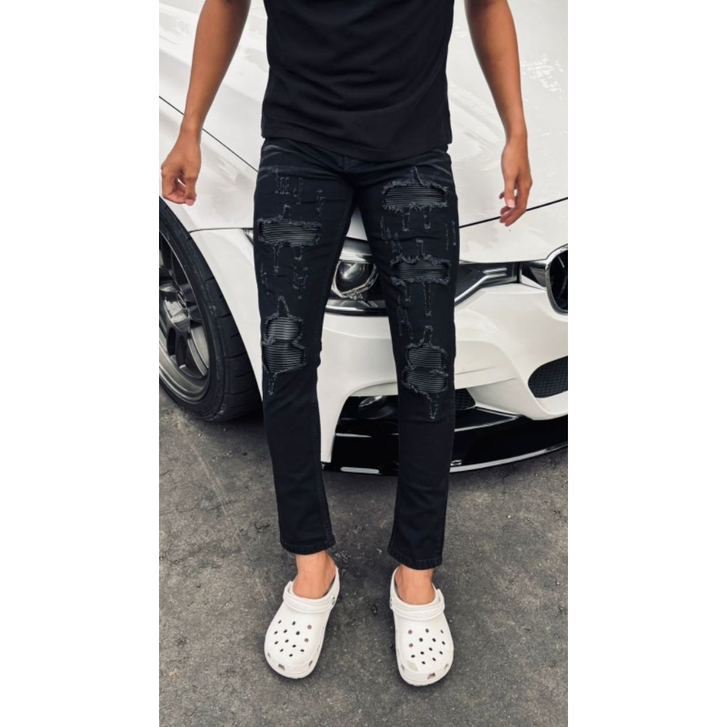 Celana Jeans Pria Skinny Ripped Black Panther Leather patch