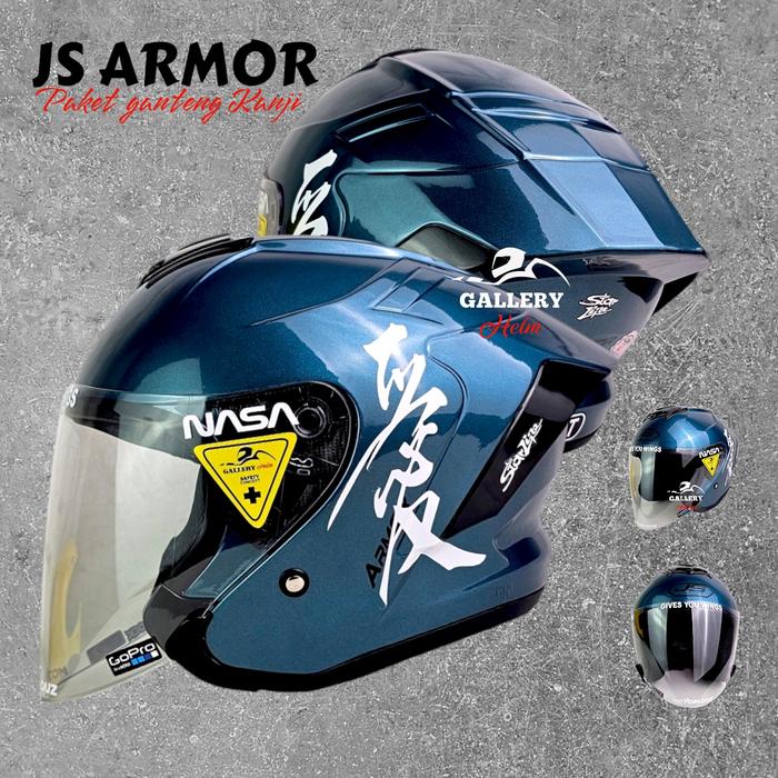 Js Armor Paket Ganteng Kanji | Helm Half Face Kekinian Iridium Motorcycle Visor - Putih Redgold (Size Tulis Dicatatan)
