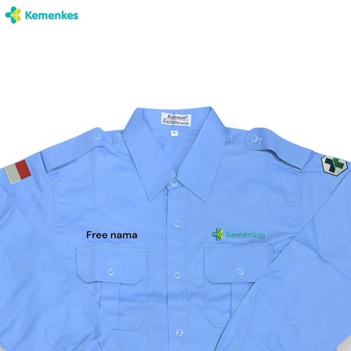 Kemeja Seragam Kemenkes RI Warna Biru Muda Pria-wanita Bahan American drill Lengan Panjang-Pendek