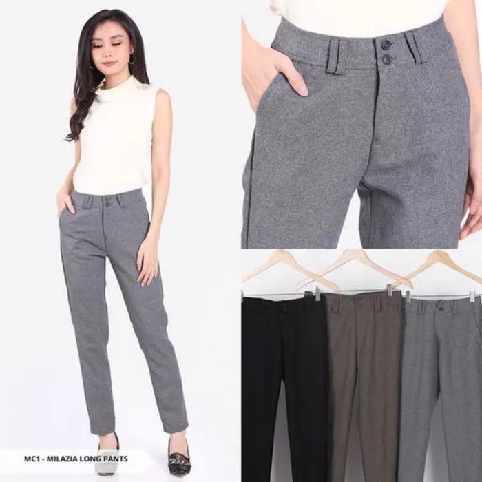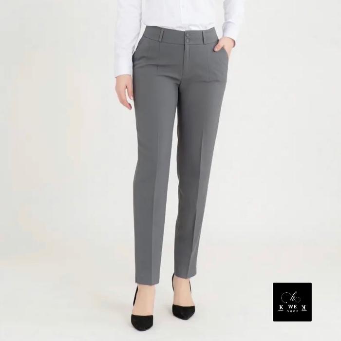 Gracella Import Celana Kerja Wanita Abu Coklat Bahan Stretch Baggy Kotak Salur Formal Nyaman Size S-Xl Mantulllll - Biru