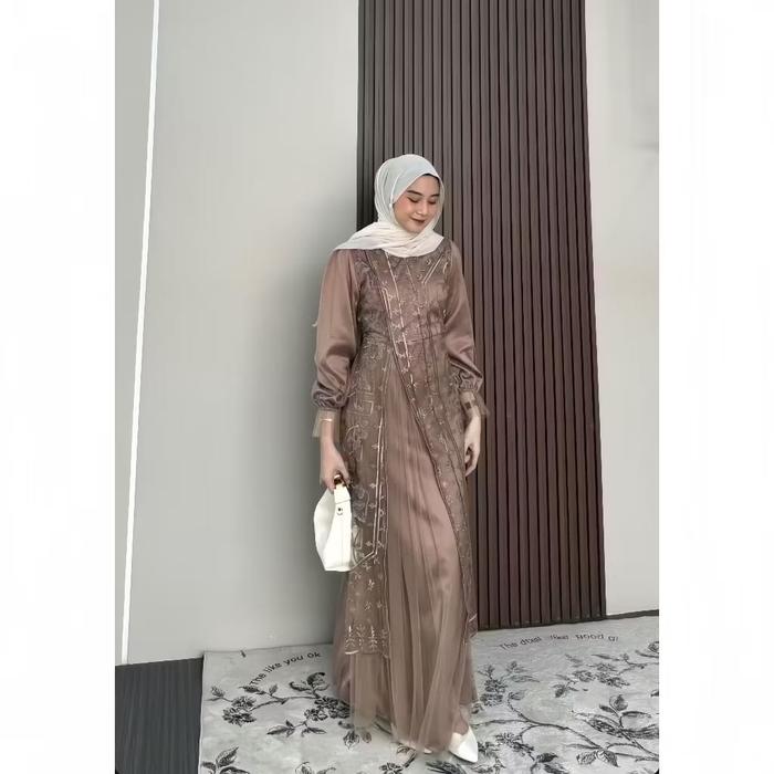 Gamis Brokat 2025 Model Baru Shabira Dress Silk Kombinasi Brokat Burgundy Baju Lebaran 2025 Idul Fitri Ukuran S M L Xl X