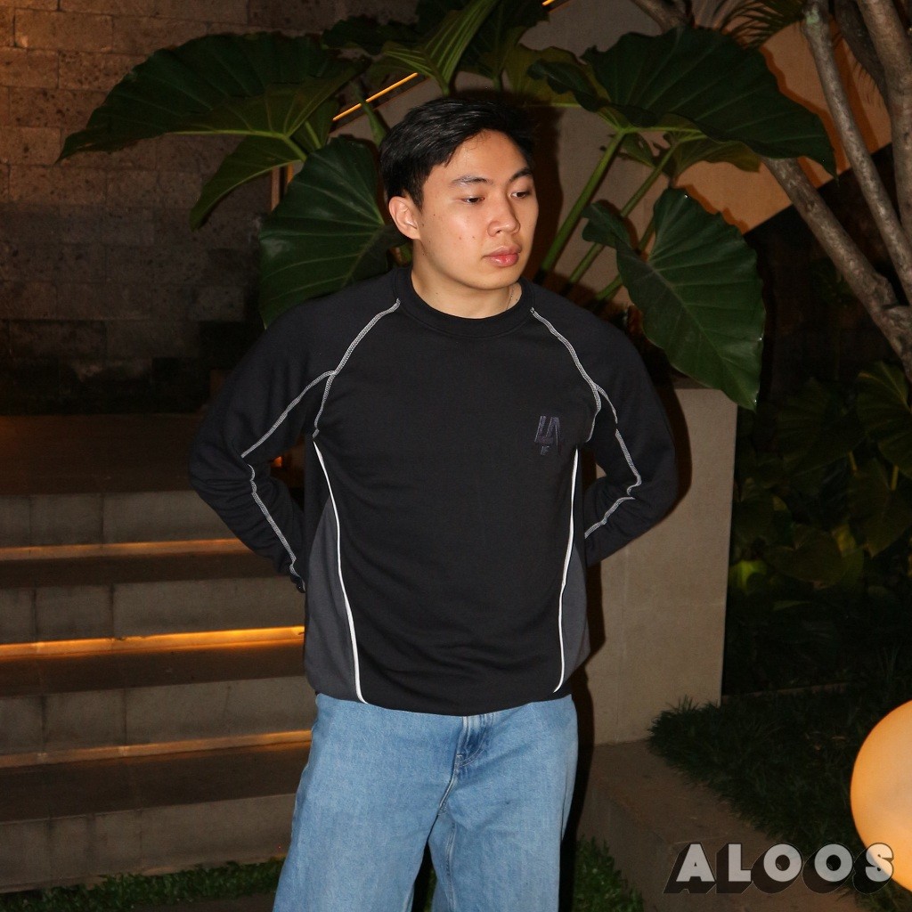 Aloos Crewneck Overdeck + White Line Black Charcoal | Sweater Bordir Kombinasi Katun Fleece 280 Gsm