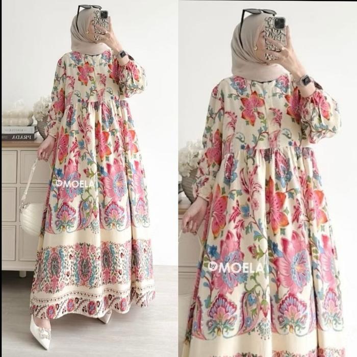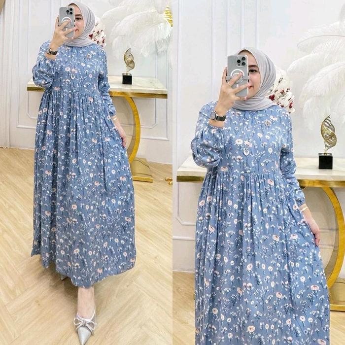 Midi Dress Rayon Viscose Motif Bunga Busana Wanita Muslim Reselting Busui Lengan Karet Gamis Ibu Menyusui Nyaman Panjang