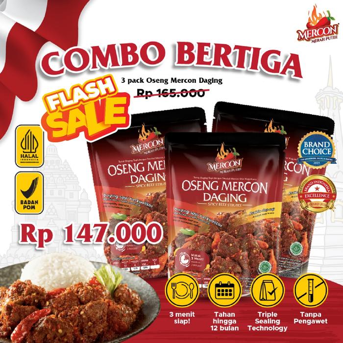 Mercon Merah Putih - Combo Bertiga 3 Pack Oseng Mercon Daging / Makanan Kaleng Siap Saji / Iga Mercon / Sambel Iga Food