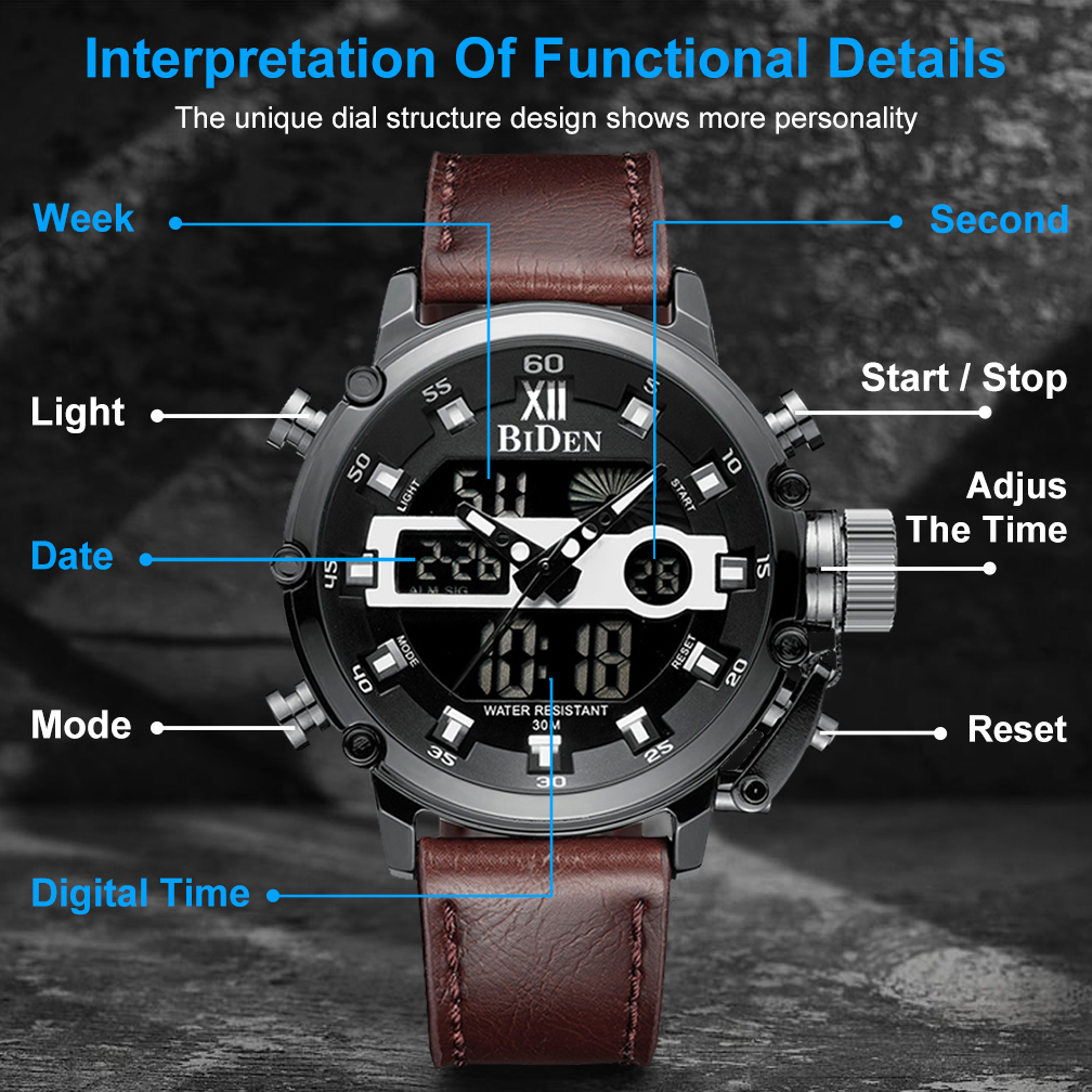 Biden Jam Tangan Pria Olahraga Militer Analog&Digital Tali Tali Kulit Anti Air Kuarsa Jam Tangan Cowok Original