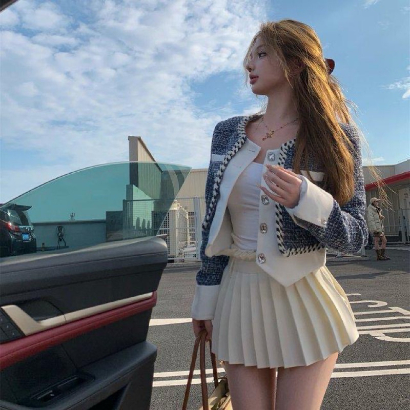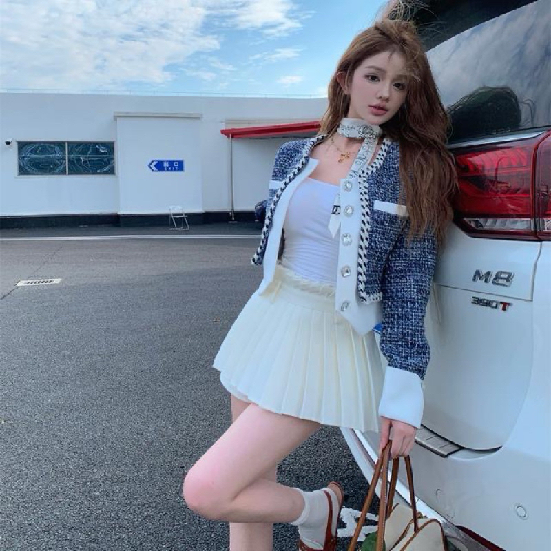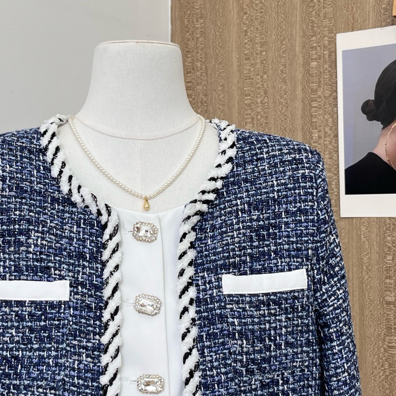 THE0NE || Fashionable Crop Blazer Tweed Fake Two Piece Tweed Buttons Premium High Quality S-2XL