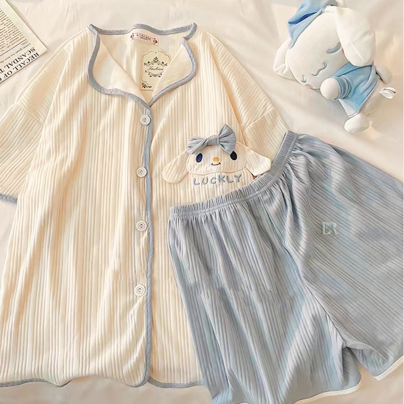 LNR Shop Piyama Baju Tidur Wanita 4ppi Lengan Panjang dan Pendek Celana Panjang dan Pendek Import Cinnamoroll Berkerah V Neck Manset Bergaris Kain Lembut All Size M - XXL Baju Rumah Santai Salur