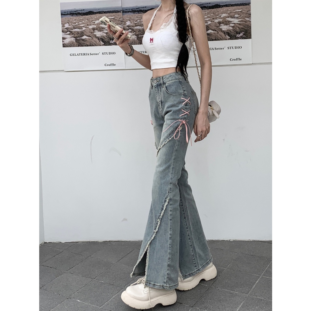 Jeans Denim Berpinggang Tinggi Bercelah Bertali Untuk Busana Retro Wanita Kecil