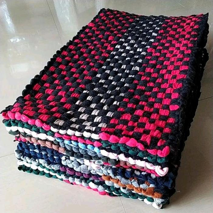 Keset Kain Anyam Tebal Homemade 50X33 Cm – Motif Garis Warna-Warni | Menyerap Air & Tahan Lama Biru Merah - Keset Anyam