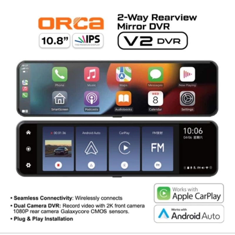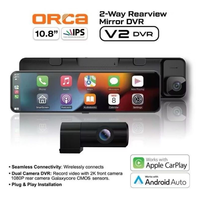 Dash Cam Orca V2 DVR On Dash Monitor Spion Tengah Layar Sentuh 2K