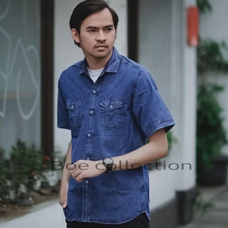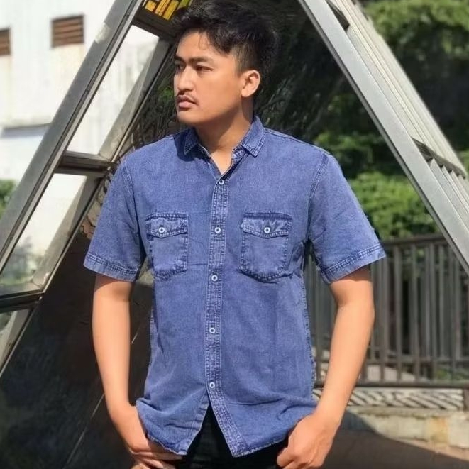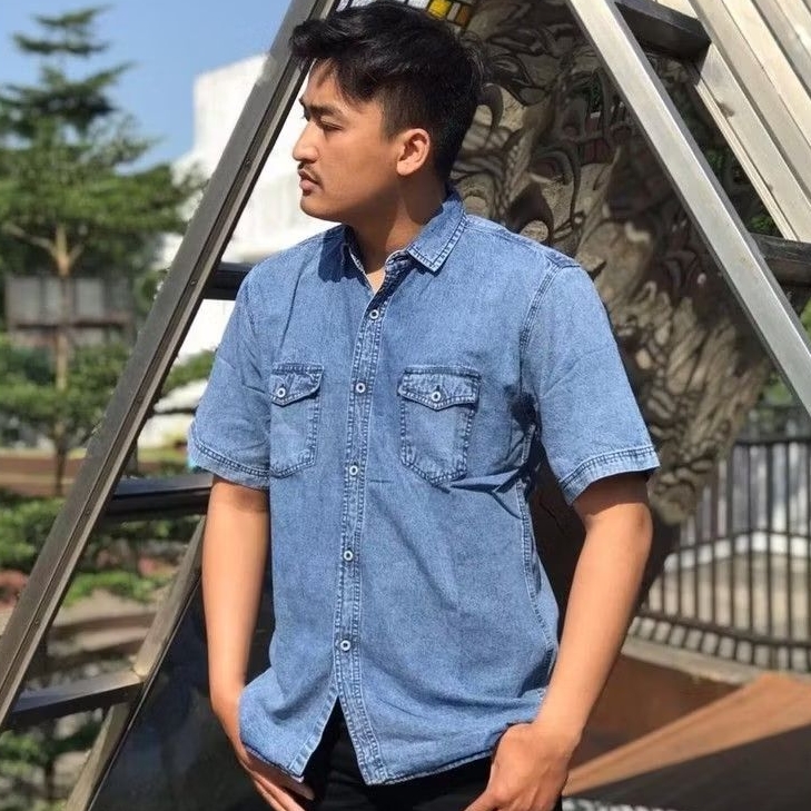 Kemeja Jeans Pria Denim Lengan Pendek Casual Nyaman