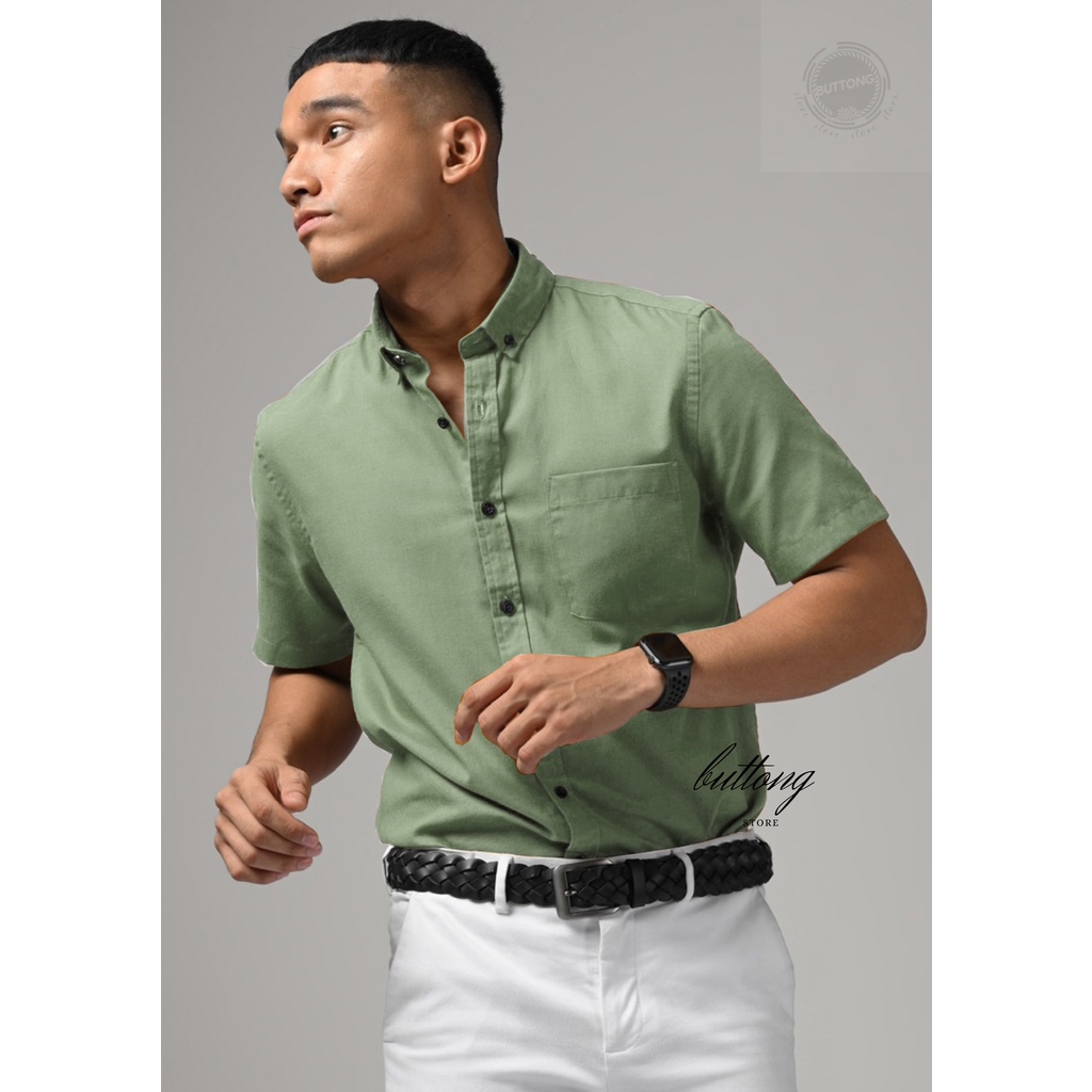 Kemeja Polos Katun Kerja Kantor Casual Lengan Pendek Pria Hijau Min Hitam Putih