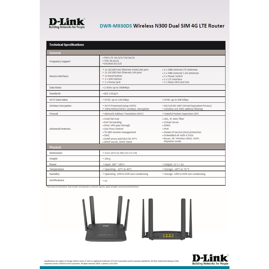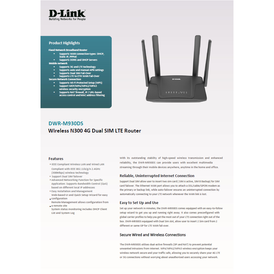 D-Link DWR-M930DS Wireless N300 Dual SIM 4G LTE Router