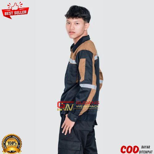 Wearpack Setelan Baju Kerja Lengan Panjang Warna Hitam Kombinasi Coklat Dan Celana Hitam