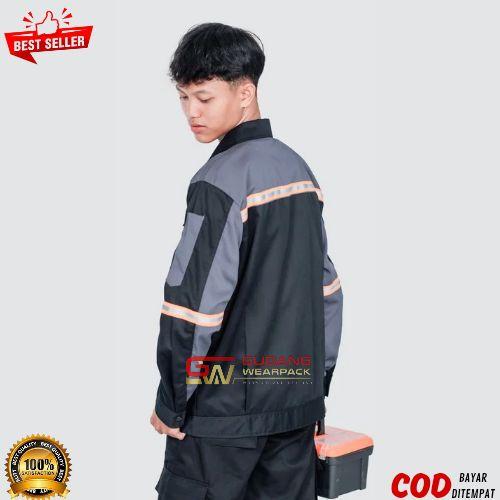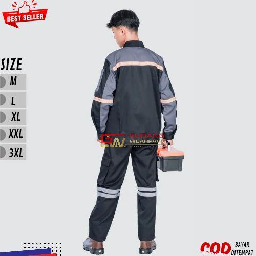 Wearpack Setelan Baju Kerja Lengan Panjang Warna Hitam Kombinasi Abu Dan Celana Hitam