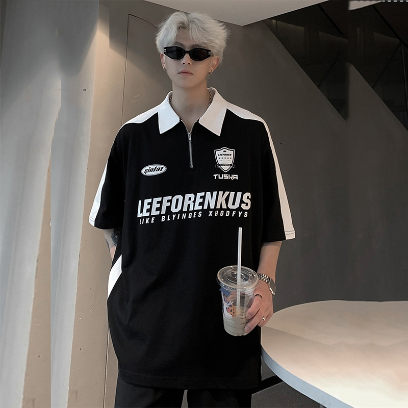 Kaos Oversize Polo Shirt Pria T Shirt Pria Black & White Kaos Polo Pria Korean Style Lengan Pendek Vintage Shirt Kaos Po