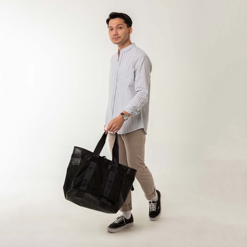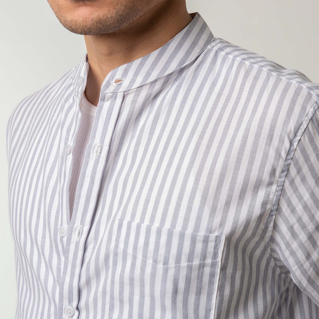 Kemeja Pria Garis Woodcutter Collarless Butcher Stripe Kerah Shanghai - Light Grey Lengan Panjang