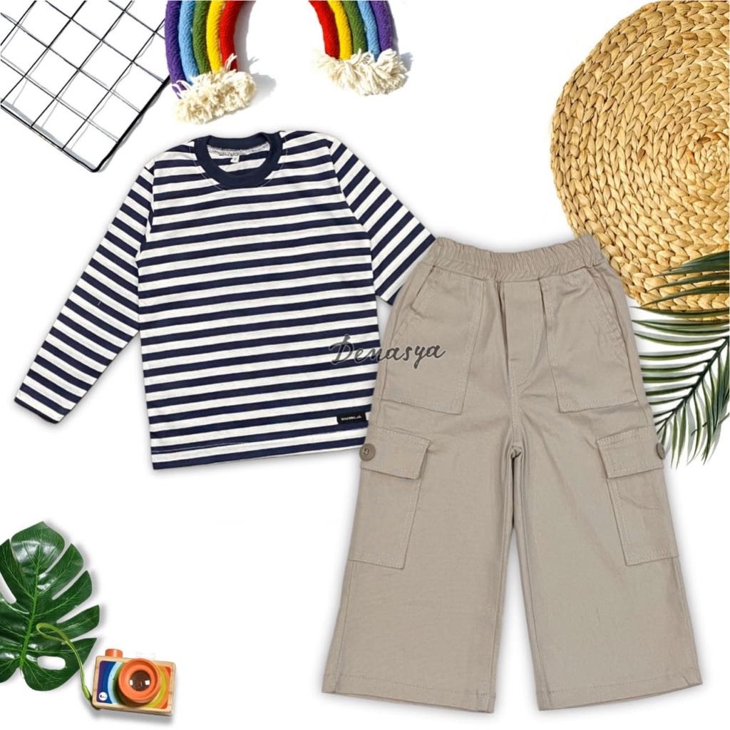 Setelan Anak Perempuan Kekinian / Celana Kulot Cargo Katun / One Set Atasan Kaos Strip Belang Tangan Panjang Usia 2-12 Tahun