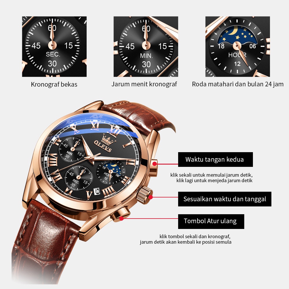 Olevs Jam Tangan Pria Original Anti Air Kulit Tahan Keren Led Hitam Coklat Luxury Chronograph Watch Men Multifungsi