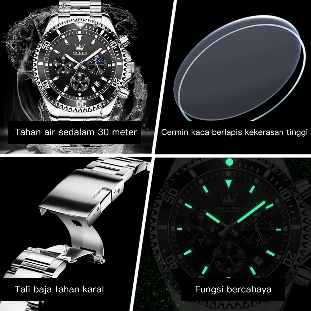 Olevs Jam Tangan Pria Anti Air Original Tahan Keren Luxury Led Analog Stainless Steel Chronograph Watch Men Hitam Model