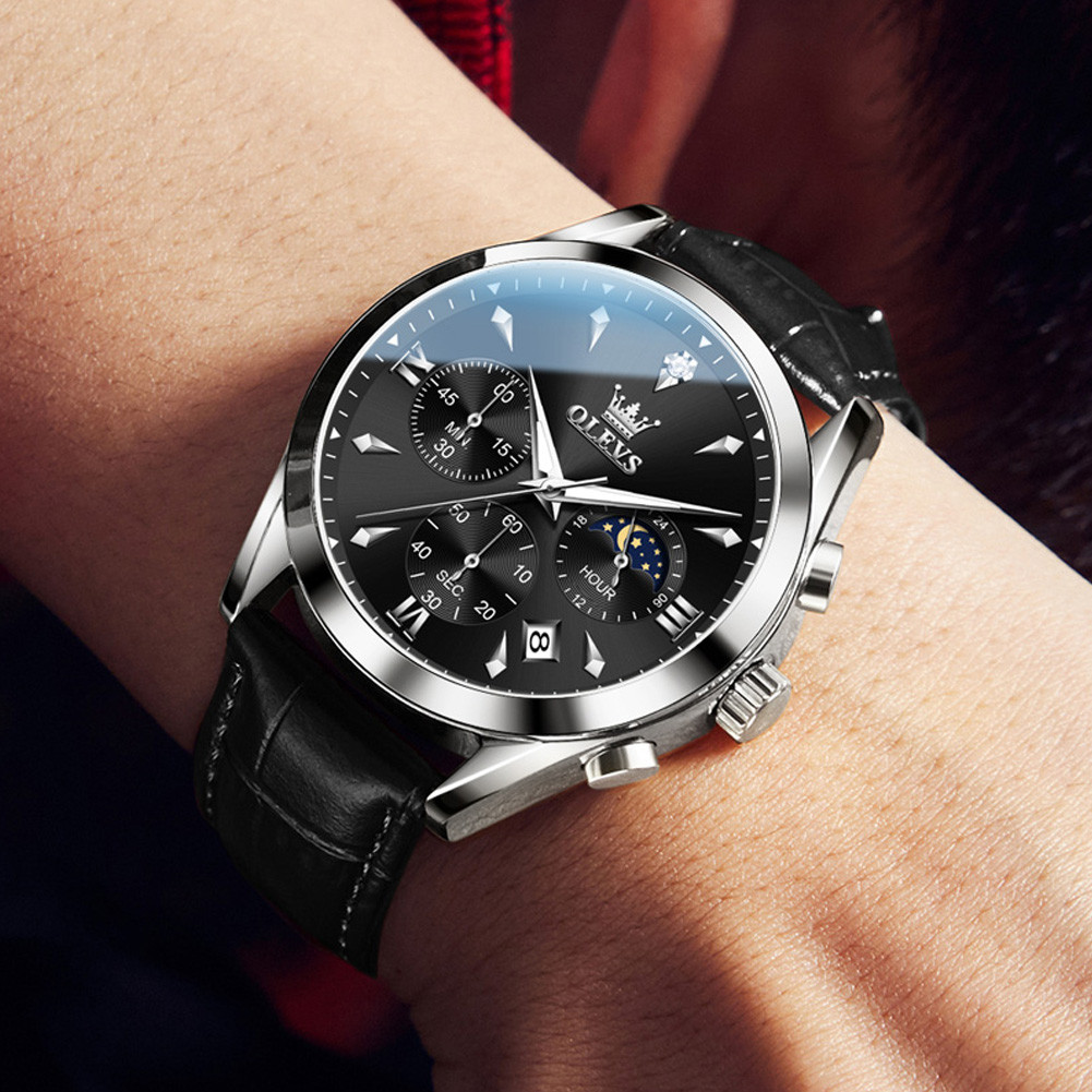 Olevs Jam Tangan Pria Original Anti Air Kulit Tahan Keren Hitam Coklat Luxury Chronograph Watch Men